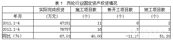 据国家统计局公布的数据,2012年1-4月份丙纶行业实际完成投资额7.88亿元,同比增加67.03%;当年以来到目前为止施工项目总数为16个,同比增加40.00%;其中新开工项目数5个,同比减少11.27%;截至4月底为止,已实现竣工项目数3个,同比增加51.20%,占施工项目总数的18.75%,表明该行业投资项目进展较好。