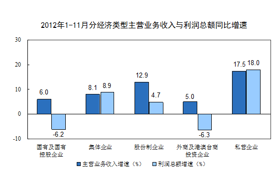 在规模以上工业企业中,国有及国有控股企业实现主营业务收入217915亿元,同比增长6%,每百元主营业务收入中的成本为82.71元,主营业务收入利润率为5.78%;集体企业实现主营业务收入10511亿元,同比增长8.1%,每百元主营业务收入中的成本为85.18元,主营业务收入利润率为6.76%;股份制企业实现主营业务收入476002亿元,同比增长12.9%,每百元主营业务收入中的成本为84.97元,主营业务收入利润率为5.74%;外商及港澳台商投资企业实现主营业务收入199638亿元,同比增长5%,每百元主营业务收入中的成本为86.11元,主营业务收入利润率为5.38%;私营企业实现主营业务收入253817亿元,同比增长17.5%,每百元主营业务收入中的成本为86.06元,主营业务收入利润率为5.89%。