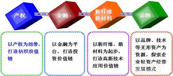 以产权为纽带,打造纺织主业价值链;以金融为平台,打造资本运作价值链;以新材料新纤维为起步,打造高新技术应用价值链;以品牌、技术等无形资产为资源,积极探索企业轻资产经营。即“三加一”发展模式。