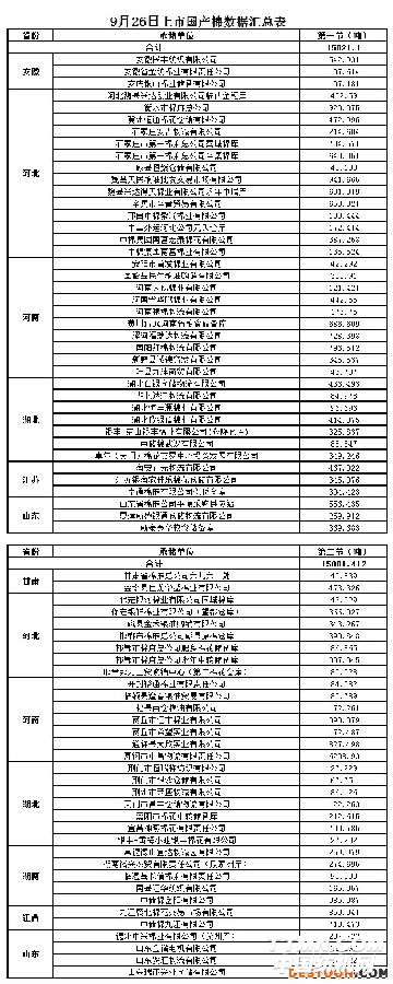 9月26日两节共计轮出储备棉30022.512吨。第一节销售储备棉15021.1000吨,其中国产棉15021.1000吨、进口棉0吨。第二节销售储备棉15001.4120吨,其中国产棉15001.4120吨、进口棉0吨。
