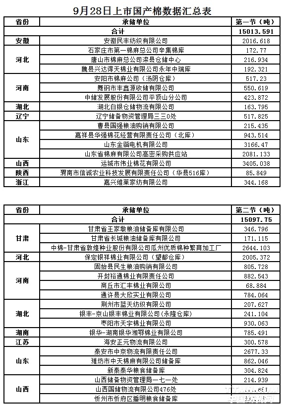 9月28日两节共计轮出储备棉30111.341吨。第一节销售储备棉15013.5910吨,其中国产棉15013.5910吨、进口棉0吨。第二节销售储备棉15097.7500吨,其中国产棉15097.7500吨、进口棉0吨。