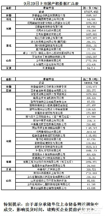9月29日两节共计轮出储备棉34054.157吨。第一节销售储备棉17137.453吨,其中国产棉17137.453吨、进口棉0吨。第二节销售储备棉16916.704吨,其中国产棉16916.704吨、进口棉0吨。