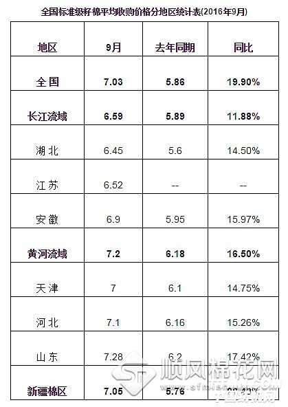 9月,内地部分棉区开始收购。由于对皮棉销售市场价格趋势难预测,加之收购价格较高,开秤企业大都谨慎收购;而棉农对后市价格看好,惜售情绪较重,收购进度慢于去年同期。内地籽棉平均收购价为6.97元/公斤,同比上涨15.6%;棉籽销售价格在2.8-3.24元/公斤,同比上涨14.5%。其中,河北省棉花企业收购的白棉3128级,衣分40%,回潮15%,杂质2%,收购价格为7.10元/公斤,同比上涨15.26%;山东省棉花企业收购的白棉3128级,衣分40%,回潮14%,杂质1.3%,收购价格为7.28元/公斤,同比上涨了17.42%;安徽省棉花企业收购的白棉3128级,衣分39%,回潮11%,杂质1.3%,收购价格为6.9元/公斤,同比上涨了15.97%。湖北省因前期受雨水天气影响,棉花产量下降,导致籽棉资源不足,400型轧花厂未入市收购,200型加工企业开秤收购现象较多,收购价格为6.45元/公斤左右,同比上涨14.5%。