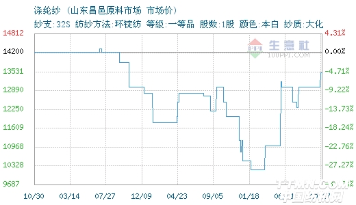 10月17日山东昌邑原料市场关于涤纶纱的报价为13500元/吨。涤纶纱的出产地为山东;涤纶纱的属性:纱支:32S;纺纱方法:环锭纺;等级:一等品;股数:1股;颜色:本白;纱质:大化。该报价有效期为7天。