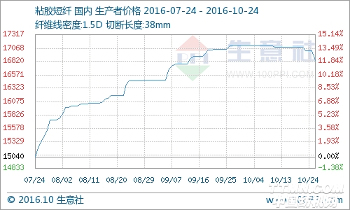 据生意社价格监测显示:10月24日粘胶短纤价格走跌,截止目前,1.5D*38mm的粘胶短纤市场均报价在16840元/吨,较上一日下跌1.06%,同比上涨14.56%。