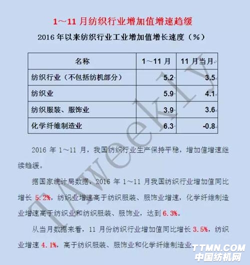 1~11月纺织行业增加值增速趋缓,化纤增速高于全行业达6.3%