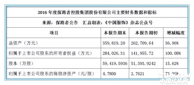 1月17日晚间,探路者控股集团股份有限公司(以下简称“探路着”)发布2016年度业绩快报,报告期内,探路者共实现营业总收入29.07亿元,比去年同期减少约24%(主要是旅行板块易游天下探索转型,大幅缩减了盈利水平较低的平台业务规模);归属上市公司股东的净利润为2.02亿元,比去年同期减少约23%(其中包含拟计提的绿野商誉减值2200万元)。同期,基本每股收益为0.3604元,较去年同期降低29.68%;加权平均净资产收益率为8.98%,较去年同期下降10.92个百分点。