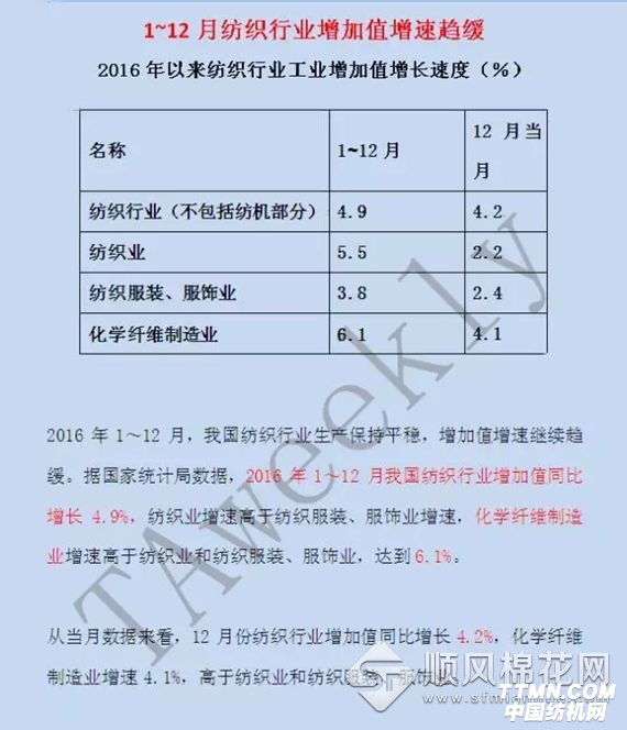 2016年全年我国纺织行业增加值同比增长4.9%,其中化纤达6.1%领跑
