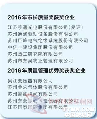 苏州市质量管理优秀奖由市政府设立。据悉,在《市政府关于表彰2016年度苏州市市长质量奖获奖企业的决定》中,2016年全市共5家单位获苏州市质量管理优秀奖,公司作为吴江区唯一一家入选参评的纺织企业,榜上有名。