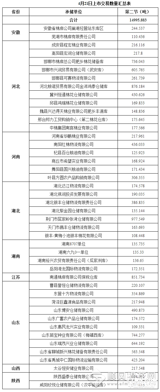 中国储备棉管理总公司定于4月21日第二节上市交易储备棉重量14995.883吨,其中需要倒垛出库68捆,相关明细见附件。