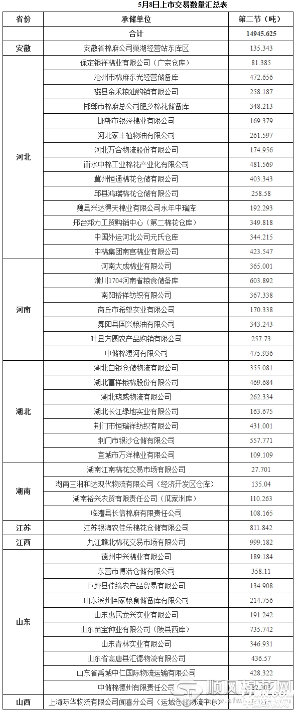 中国储备棉管理总公司定于5月8日第二节上市交易储备棉重量14945.625吨,其中需要倒垛出库77捆,相关明细见附件。 具体库点及数量如下: