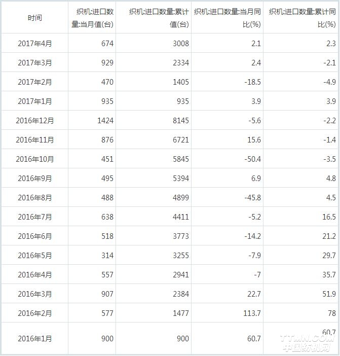 进口纺织机械是提高产品附加值、降低企业成本,实现企业转型升级的重要途径。数据显示,2017年4月我国织机进口674台,当月同比上涨2.1%,1-4月累计进口3008台,累计同比上涨2.3%。