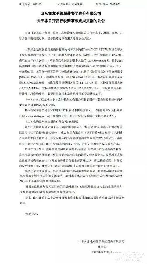 山东如意在其公告中表示,经过多方共同努力,公司已经取得了温州庄吉的控制权,收购温州庄吉51%股权相关的交割事项已全部实施完毕,温州庄吉成为公司的控股子公司并将纳入公司2017年上半年财务报表合并范围。根据如意投资与公司签订的关于温州庄吉51%股权转让协议约定的业绩承诺和过渡期间损益归属等条款仍按照原协议执行。