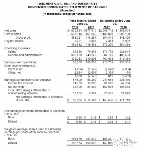 截至2017年6月31日的3个月内,Skechers核心财务数据如下: