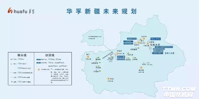 华孚自2006年开始投资新疆,累计投资50亿元,年纳税 1.6 亿元,员工就业14700人。目前共有棉田8万亩;轧花厂30多个,年棉花加工能力20余万吨;染厂3个,产能3万吨;纺厂10个,67万纱锭,产能11万吨。