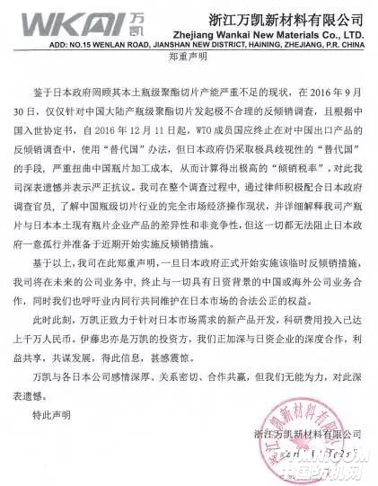 鉴于日本政府罔顾其本土瓶级聚酯切片产能严重不足的现状,在2016年9月30日,仅仅针对中国大陆产瓶级聚酯切片发起极不合理的反倾销调查,且根据中国入世协定书,自2016年12月11日起,WTO成员国应终止在对中国出口产品的反倾销调查中,使用“替代国”办法,但日本政府仍采取极具歧视性的“替代国”的手段,严重扭曲中国瓶片加工成本,从而计算得出极高的“倾销税率”,对此我司深表遗憾并表示严正抗议。我司在整个调查过程中,通过律师积极配合日本政府调查官员,了解中国瓶级切片行业的完全市场经济操作现状,并详细解释我司产瓶片与日本本土现有瓶片企业产品的差异性和非竞争性,但这一切都无法阻止日本政府一意孤行并准备于近期开始实施反倾销措施。