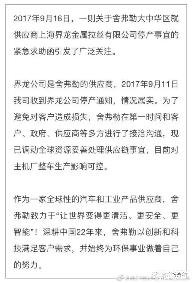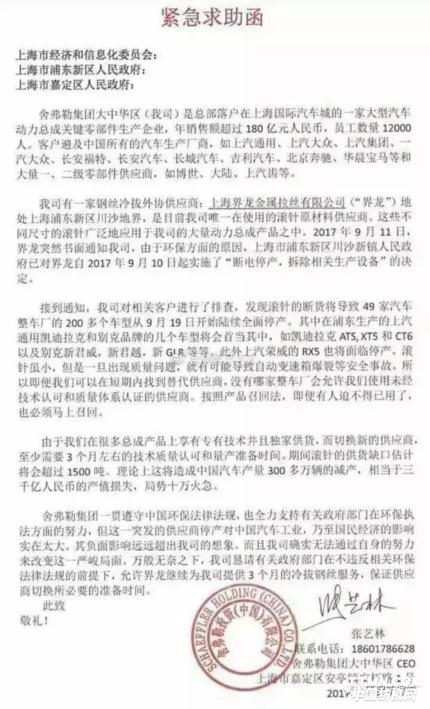 9月14日舍弗勒大中华区CEO致函上海市有关部门,称其原材料供应商上海界龙金属拉丝有限公司因环保问题将被关停,公司面临供货危机,并称“此问题将会导致49家车企,200多款汽车或因此停产三个月,会造成3000亿元的产值损失”。