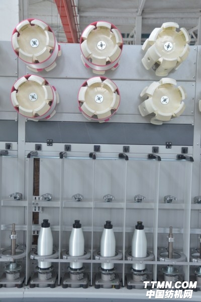 1.积极式送纱,丝筒采用单锭位马达驱动,运转平稳,保证了整机丝筒的一致性,纺纱线速度高,大幅提高了生产效率,减少丝道摩擦点及纺纱工艺调整方便,采用平行丝筒,丝筒跳动小,优化的导纱角度,降低毛羽,适合不同长度的原丝筒。