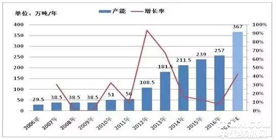 己内酰胺是生产锦纶的主要原料。2012年以前,国内己内酰胺一直以进口为主,进口额一直保持在40万~70万吨/年之间。这成为制约我国锦纶产业发展的一大瓶颈。但随着近年来的产能持续扩张,进口需求下降,由2012年最高峰时期的70多万吨/年进口需求降到2016年22多万吨/年左右。主要原因就是,2012年后国内己内酰胺产能产量剧增,已经完全满足了国内自身需求,并且出现了过剩。据了解,2016年产能达到257万吨,而2017年据不完全统计,至年底国内己内酰胺总产能将达到367万吨,年增长率为42.8%,历史最高。