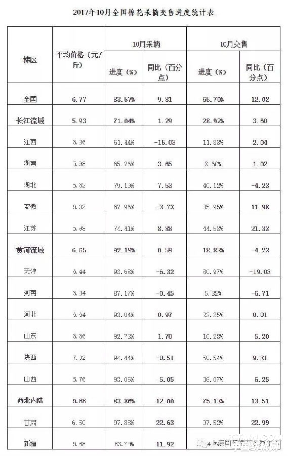2017年10月,中国棉花协会棉农分会对内地12个省市和新疆自治区2927个定点农户进行了棉花采摘、交售情况调查,调查结果显示:10月,全国大部棉区气象条件利于棉花采摘,进度加快;黄河西部和江淮江汉阴部分棉区阴雨寡照,对棉花品质造成一定影响。截止10月底,全国采摘进度为83.6%,同比加快9.81个百分点;交售进度为65.7%,同比加快12.02个百分点。全国棉花平均交售价格为6.8元/公斤,同比下降6.2%。