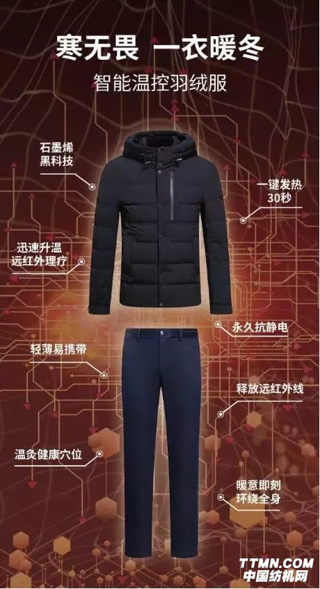 30年前,羽绒服以轻便、保暖的优势,似乎在一夜之间风靡大街小巷。而30年间,各大品牌除了在填充物是鹅绒还是鸭绒、颜色和款式上做不同改变以外,在羽绒服最重要的“保暖”功能上并没有太大突破。消费者在购买羽绒服时仍然会遇到无法判断含绒量多少,保温效果如何,是否能达到理想温度等问题,而实际上这才是羽绒服真正的终极问题——是否足够御寒?七匹狼利用黑科技给出了完美答案。今年,七匹狼将“新材料之王”石墨烯加入羽绒服中,推出一套“黑科技”新品——智能温控羽绒服和休闲裤,让羽绒服也能“充电”。