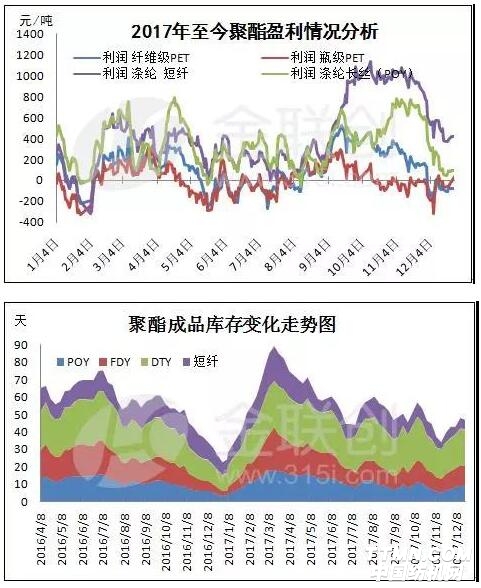 从上图中可以看出,自2016年G20峰会之后,聚酯工厂开工率持续维持高位,即便是2017年春节期间,聚酯开工率也只降到了70%左右。也就就是说聚酯工厂在长达一年半的时间内都处于高负荷运转,随着春节的日益临近,进入1月中旬聚酯开工率下滑的概率较大。