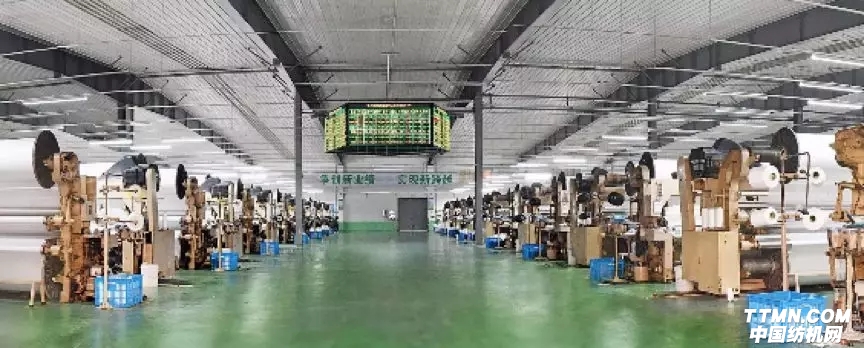 与传统织造车间相比多了几块电子大屏显示操作工人及班组的生产效率、运转率等数据