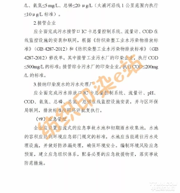 本次印染行业整治,自设排口的印染企业、接管企业、接纳印染废水的污水处理厂执行相应废水排放标准,所有印染企业还需编制环境风险应急预案,建立应急组织体系。