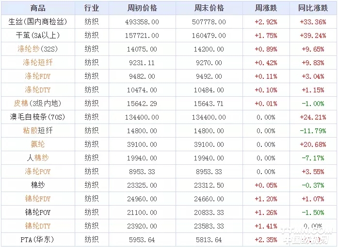 2018年第03周(1.15-1.19)纺织大宗商品价格涨跌榜
