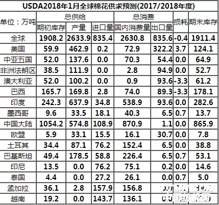 USDA(2018年1月):上调全球棉花产量、消费量 下调库存