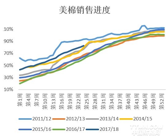种植面积方面,自2015/16年度实行STAX开始,ICE12月期价在预测价格发现期逐年提高的同时,美棉的种植面积保持增加趋势,目前ICE12期价走势向好,预计18/19美棉种植面积增加的概率较大。近17年美棉种植面积的最大值为558.6万公顷,17/18年度美棉种植面积在459.3万公顷,私营分析公司Informa预估美国2018年陆地棉种植面积为1320万英亩(约532万公顷),按照17/18单产预计18/19美棉产量的增幅在72万吨,若按近5年年均单产939计算18/19年美棉产量增幅在67万吨。