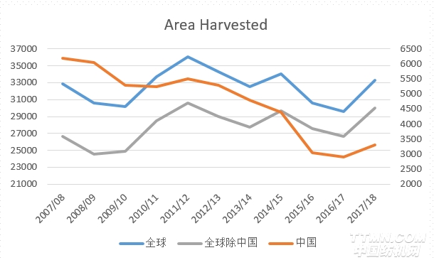 1.全球棉花产量自15/16 年低位开始恢复,产量增速远快于消费,产量的快速提高得益于种植面积和单产的同步提高。17/18 年度全球产量超过全球消费值,扭转了前两年产不足需的状况,带来了17/18年度全球宽松的基调。