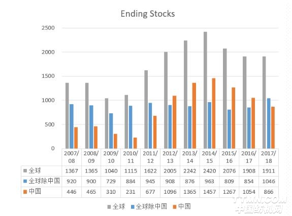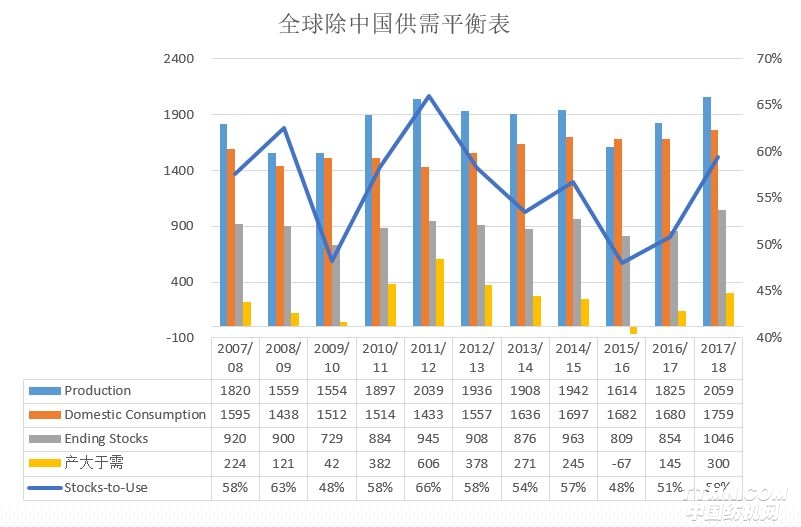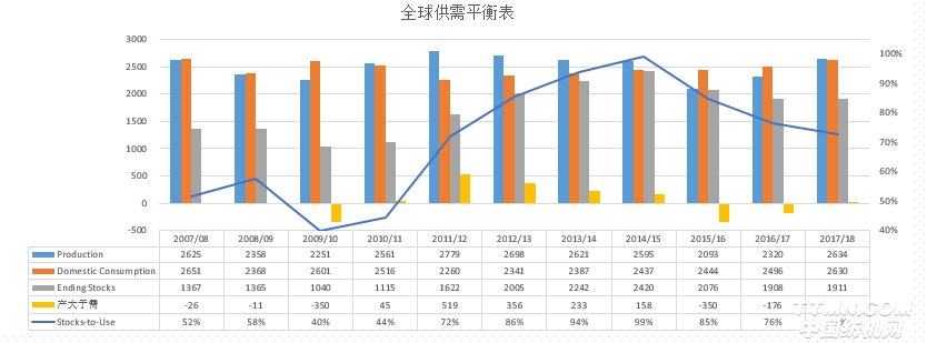 全球除中国地区连续两年产量大于消费,17/18甚至达到了11/12年度以来的历史高位300万吨,在中国国储连续两年去库存的同时,中国外的库存在不断累积。