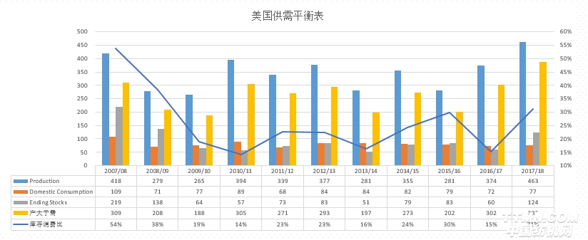 美棉产量近三年呈逐年上升趋势,国内需求保持相对稳定,期末库存大增64万吨,17/18年美棉在平衡表上呈现宽松格局。