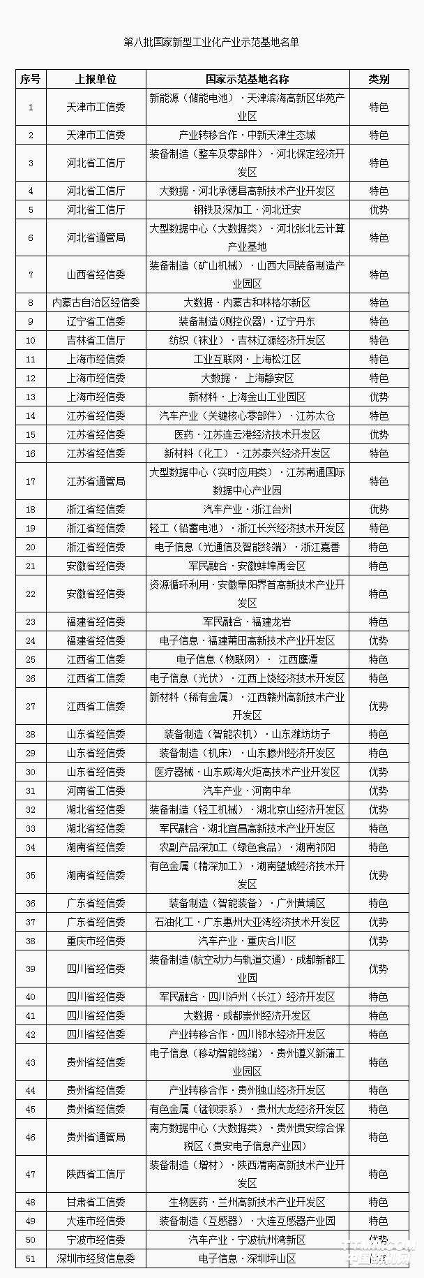 根据《关于深入推进新型工业化产业示范基地建设的指导意见》(工信部联规〔2016〕212号),按照《国家新型工业化产业示范基地管理办法》(工信部规〔2017〕1号)及《关于组织申报2017年度国家新型工业化产业示范基地的通知》(工信厅规函〔2017〕449号)要求,经评审和公示,同意上海金山工业园区等15个产业集聚区为“国家新型工业化产业示范基地(优势类)”、天津滨海高新区华苑产业区等36个产业集聚区为“国家新型工业化产业示范基地(特色类)”(具体名单见附件),现予以公布。有关事项通知如下: