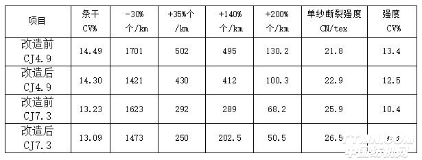 我们对针织纱CJ4.9tex、CJ7.3tex进行了成纱指标对比试验