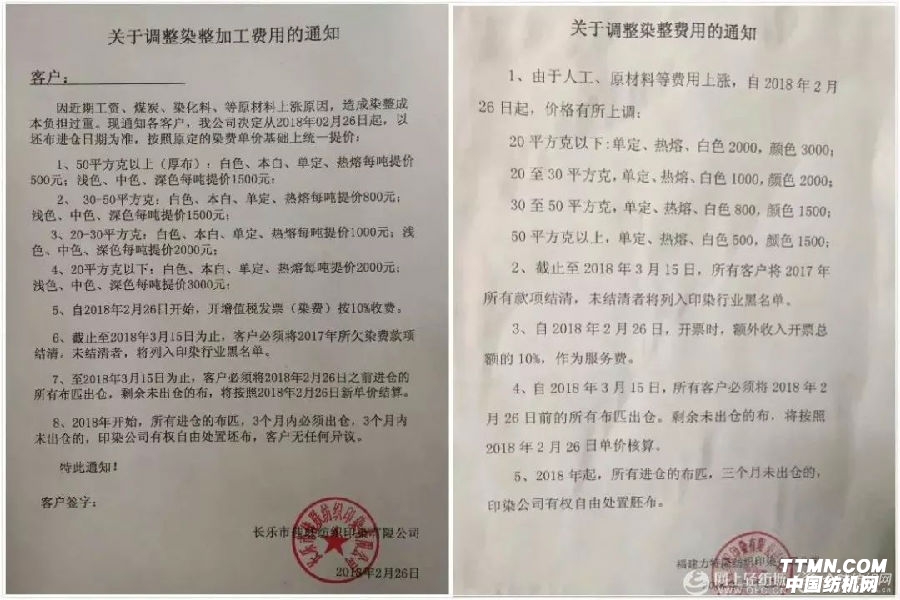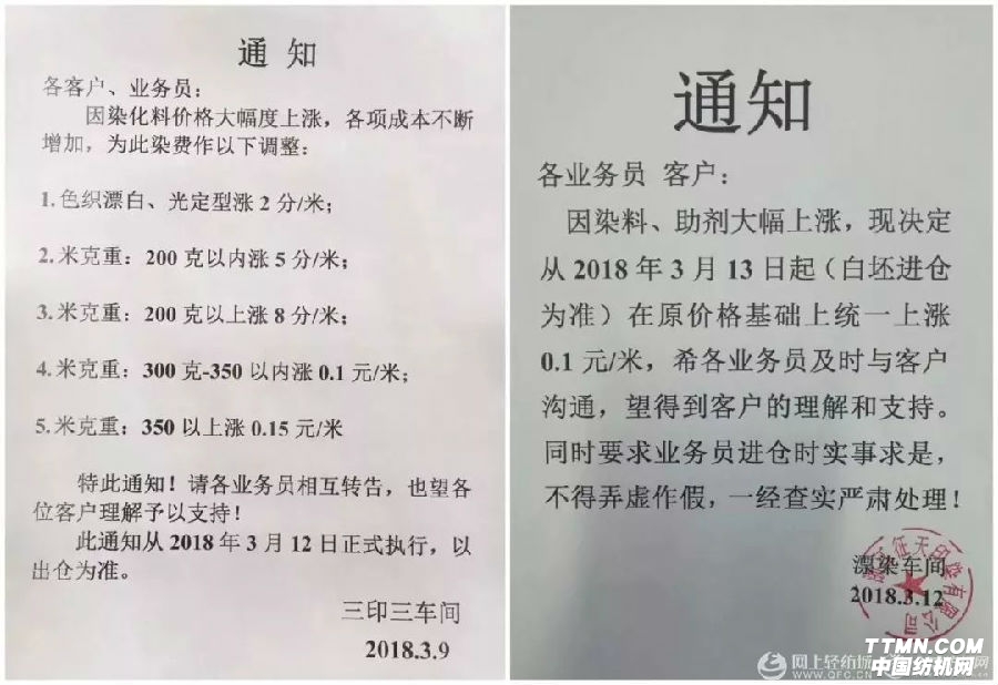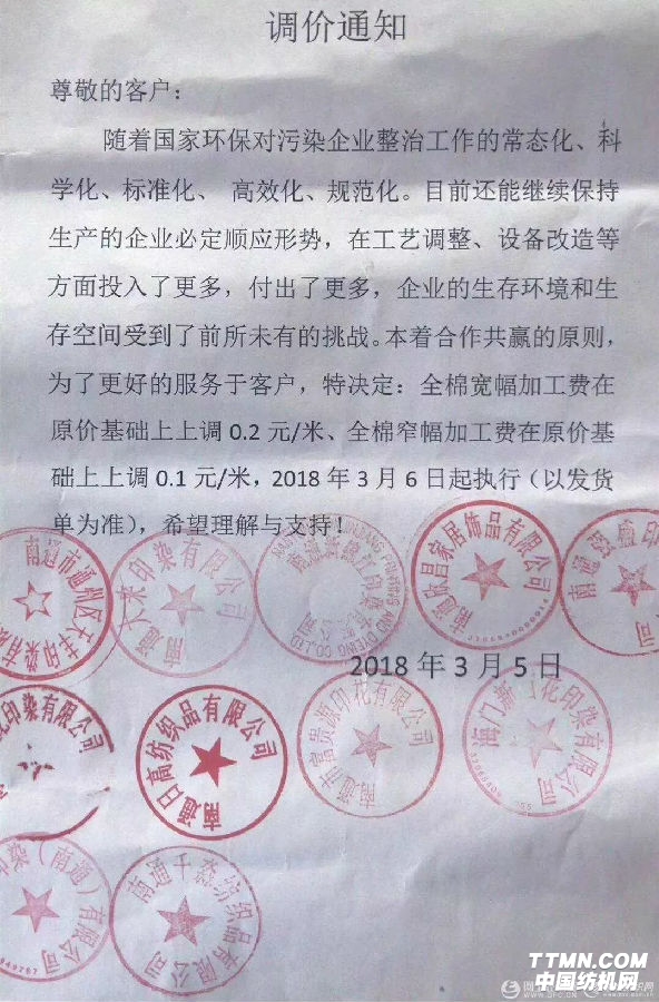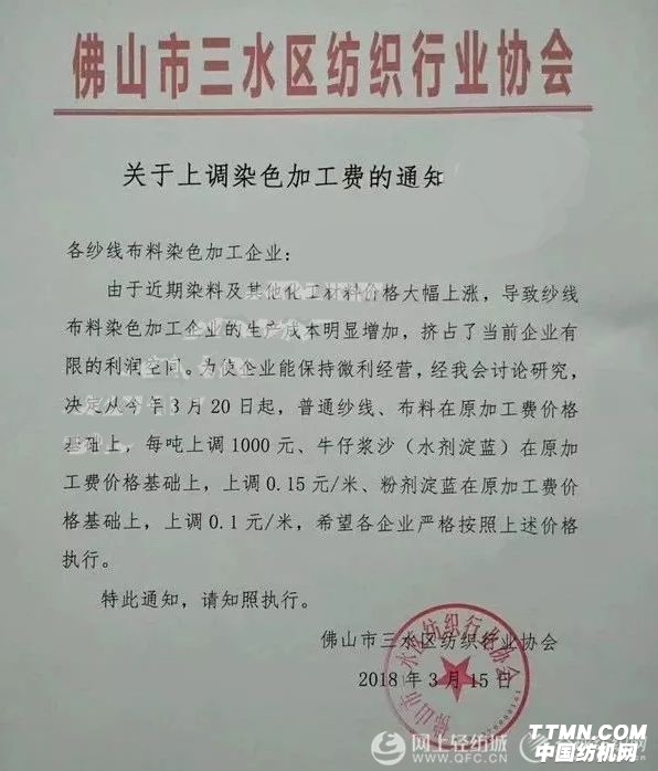 如2018年2月底,福建长乐等地区印染企业打响染费涨价第一炮。调价函称,此次染费上涨的主要是基于近期染料、煤炭、工人工资等成本急剧上升的原因,企业负担过重,不得不涨价。2018年3月初,南通地区11家印染企业统一发布提价函称,企业的生存环境和生产空间受到了前所未有的挑战,并在此节点上上调加工费用。