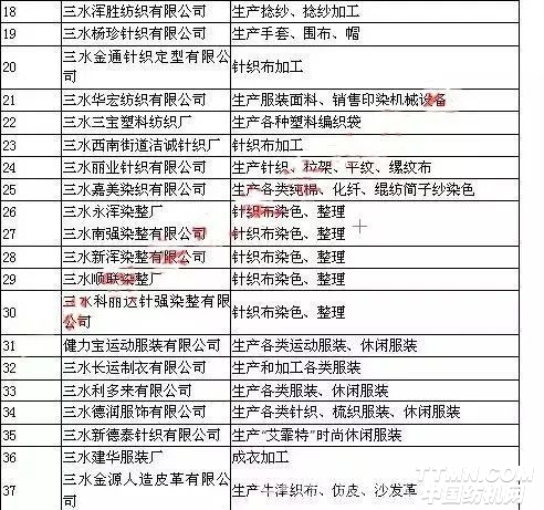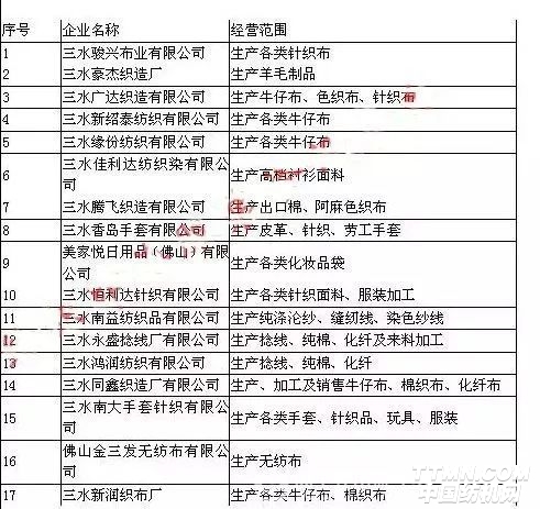 从佛山市三水区政府公开资料获悉,三水区纺织行业商会(2014年)企业有37家,涉及纱线,布料,牛仔,皮革,服装等。