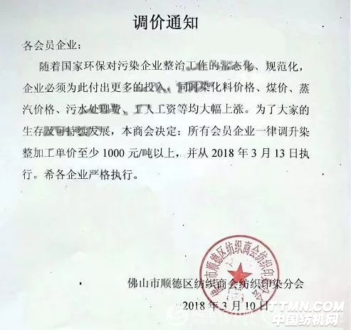 佛山市顺德区纺织商会纺织印染分会调价通知