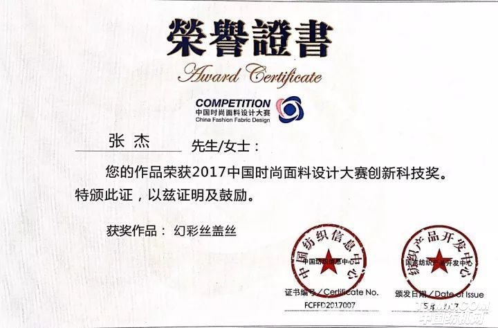 这两天,柯桥汉唐纺织有限公司总经理张杰掩饰不住内心的喜悦,最近他们公司研发成功的幻彩丝盖丝面料、幻彩冰康、幻彩暖阳三款面料经过国家针织产品质量监督检验中心检测后,各项指标都达到了预期的目的,他和他的团队潜心研发一年半之久的产品终于修成正果。