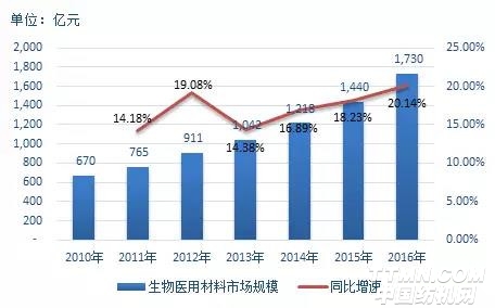 我国生物医用材料研制和生产迅速发展,初具规模,现已经成为一个新兴产业,总产值的增长率远高于国民经济平均发展速度。目前,我国生物医用材料在临床应用中主要用作医疗器械,已成为整个医疗器械产业的重要基础,其产品约占医疗器械市场的4-5成。据统计数据显示,2010年我国生物医用材料市场规模约670亿元,发展到2016年增长至1,730亿元左右,增长了158.21%;近几年增速呈加快趋势,目前年增长已达20%左右,保守估计至2019年,我国生物医用材料市场规模可达6,000亿元左右。