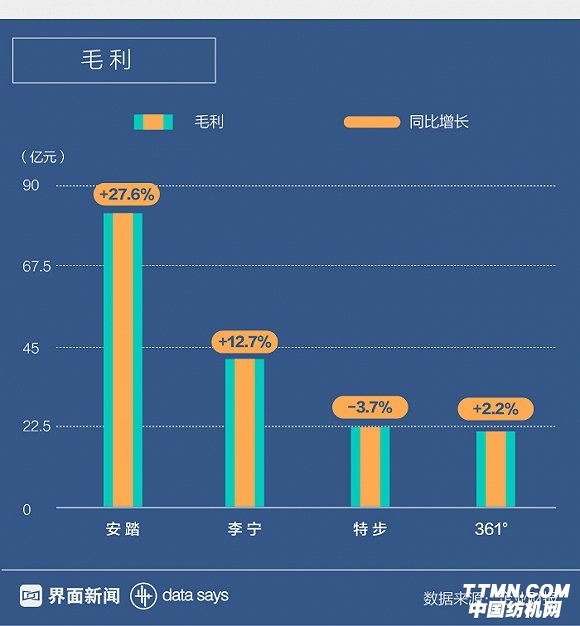 安踏、李宁、特步和361°的毛利,分别为82.41亿元、41.76亿元、22.45亿元和21.56亿元。同样受到战略转型的成本因素影响,特步是唯一出现毛利下滑的品牌。