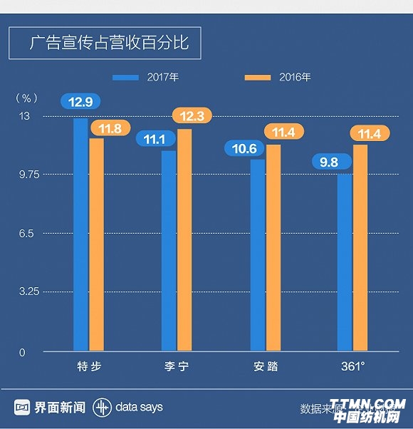 配合以跑步为主的专业运动战略,2017年特步赞助40场赛事,是赞助最多马拉松赛事的本土品牌,广告宣传费用占比高居首位。安踏这一数字有所下降,该公司表示是收益显著增加所致。