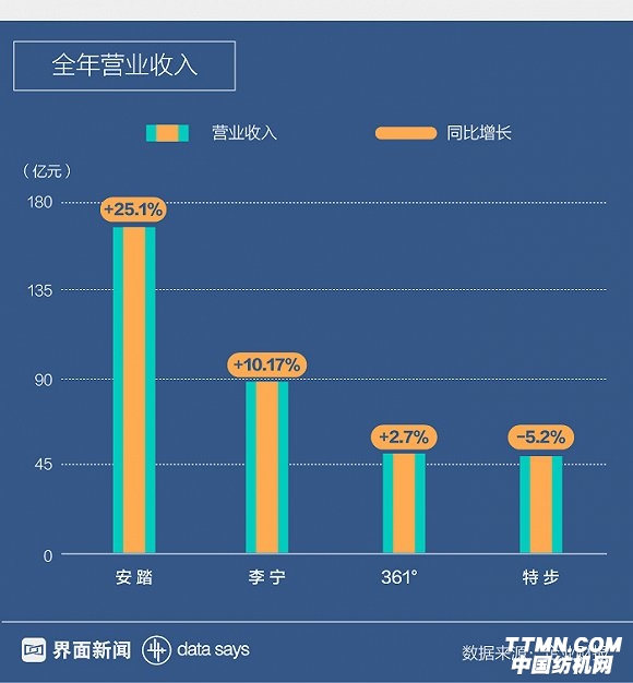 安踏、李宁、361°和特步的全年营收分别为166.92亿元、88.74亿元、51.58亿元和51.13亿元。受到战略转型和零售渠道变革的影响,特步是唯一出现营收下滑的品牌。