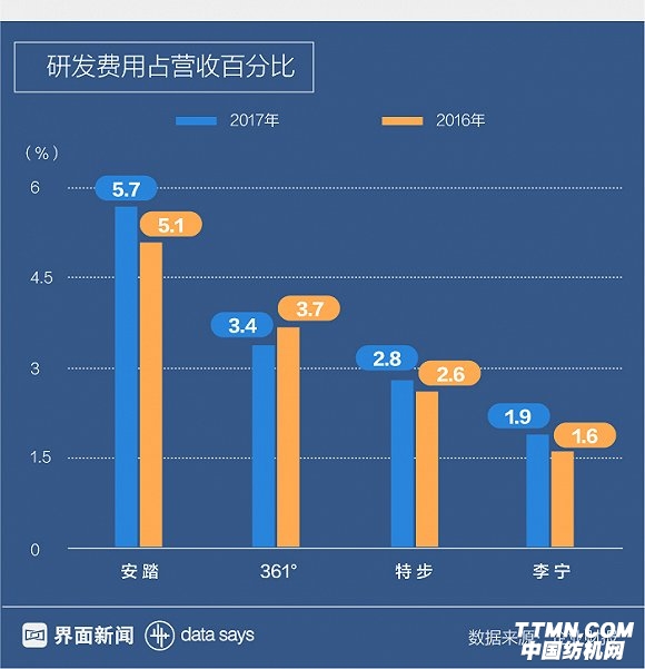 随着主流消费群体的运动层次和产品要求不断提高,各大运动品牌愈发注重产品研发创新。从2009年起,安踏的研发活动成本比率连续9年处在上升趋势,为国内行业第一。李宁的研发投入虽然有所增长,但其比例在四大品牌中垫底。