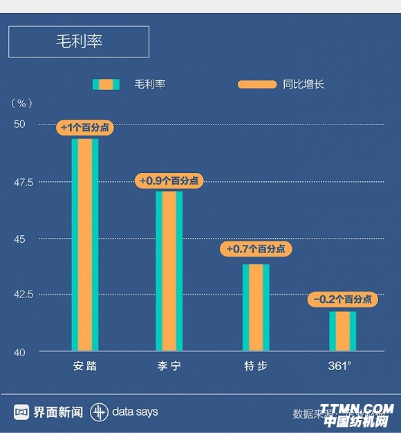 此外,李宁和特步的毛利率分别达到47.1%和43.9%。361°是唯一下跌的品牌,以41.8%的毛利率垫底。