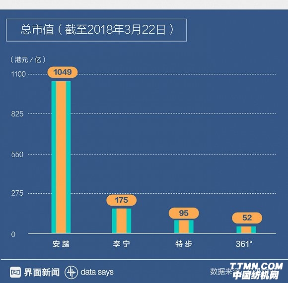 截至2018年3月22日,安踏的总市值达到约1049亿港元,仅次于国际巨头耐克和阿迪达斯,位列全球运动品牌行业第三。与此同时,安踏的市值是李宁的6倍,特步的11倍,361°的20倍。