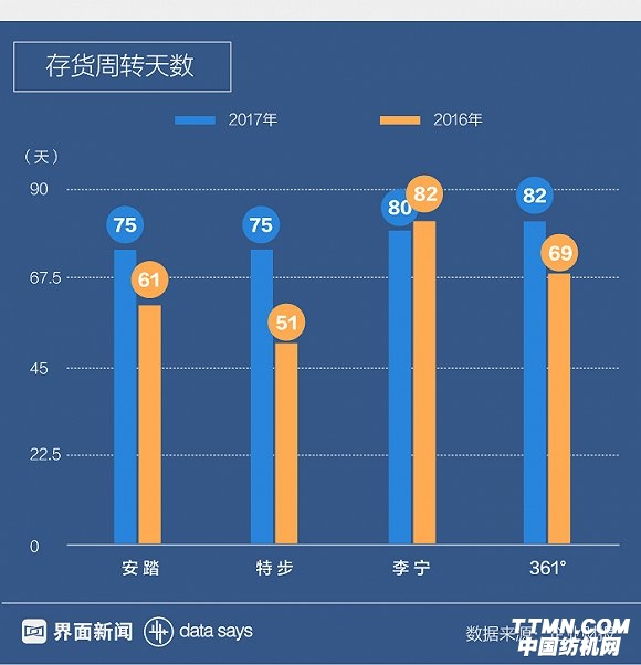 安踏的平均存货周转天数从2016年61天上升至75天,对此,安踏称原因在于集团特意延后产品交付至店铺,以满足2018年2月农历新年的销售。特步和361°的存货周转天数亦有不小的增幅,由于库存结构改善,李宁下降2天。
