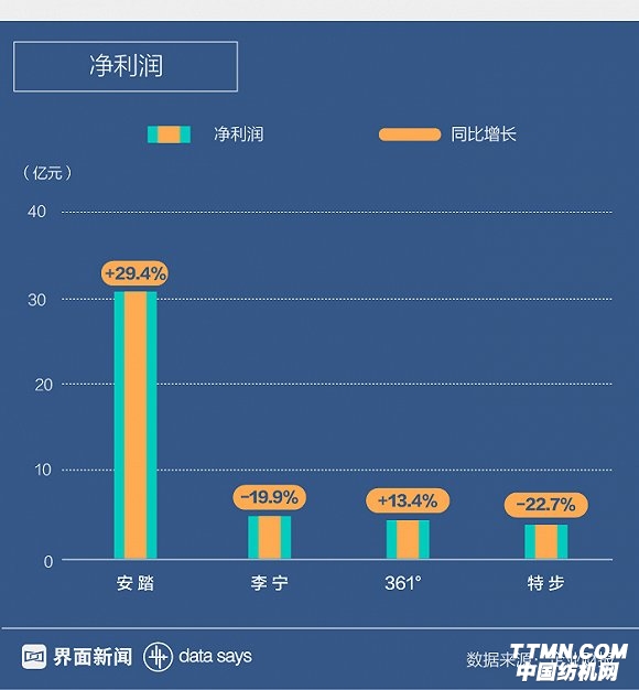 安踏的净利润为30.9亿元,361°则达到4.57亿元,两者获得不同程度的增长。
