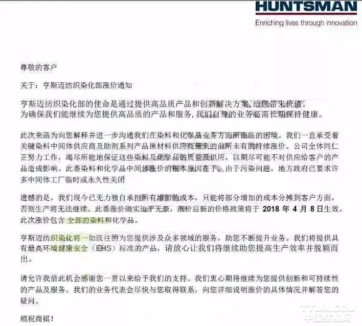 亨斯迈纺织染化部的任务是经过供给高品质产品和立异解决方案,给您带来价值。为保证咱们能持续为您供给高品质的产品和效劳,咱们本身的事务必需长期保持健康。此次来函为向您解说并进一步交流咱们在染料和化学品事务方面所面对的窘境。咱们一向承受着要害染料中间体供货商及助剂系列产品原材料供货商带来的史无前例的持续提价。